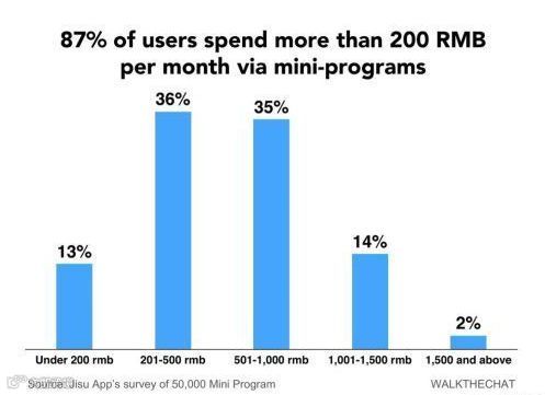 根据大数据显示,87%微信小程序用户每月会在上面消费超过200元。同时微信小程序从诞生到现在,用户使用它的时间已经从平均每天1.6分钟增加到了平均每天9.8分钟。此外,数据还显示大多数微信小程序用户都是女性用户。