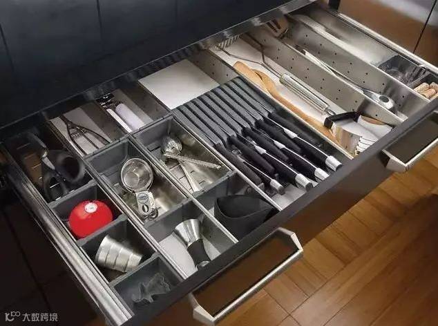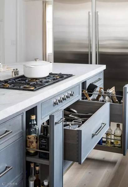 抽屉可以让物品分类摆放,而柜子因为空间大,很难填满,除了浪费橱柜空间外,拿起东西来也很不方便。当然,不是说柜子完全舍弃,收纳一些大件电器或厨具还是有必要的。设计前一定要衡量清楚。