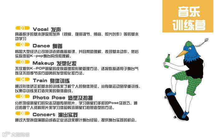 北京拇指计划文化传媒有限公司集舞蹈培训、声乐培训、艺人培养、艺人急训、练习生培训、舞蹈编舞、编曲、艺人包装推广等为一体,助力学员实现梦想,为业内源源不断输送新鲜血液。蒲公英高校音乐计划通过吸纳高效中对自己职业生涯发展有追求的大学生,鼓励大学生坚持自己的梦想,帮助他们激发灵感、鼓励创作,提供专业培训及项目实训的方式,并利用官方资源对优秀艺人进行推广,培养其成为一名优秀艺人。每一位优秀的人员都将在蒲公英高校音乐计划的支持下,增强市场竞争力,受到更多粉丝追捧。