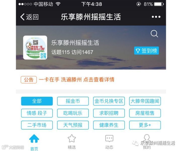 点击“摇摇社区”进入,社区中依然保留“摇金币”“金币兑换”的入口,方便粉丝们继续摇啊摇。除此之外还有大滕帝国趣闻、情感段子、吃喝玩乐、求职招聘、房屋租售、二手市场、天气预报、健康养生、孕产育儿,新品上架十大板块,大家可以在对应版块发布或是寻找自己需要的咨询信息(黄赌毒骗子除外)绝对可以满足摇摇粉丝们的精神需求。点击“阅读原文”即可进入摇摇社区吃一波“精神食粮”。