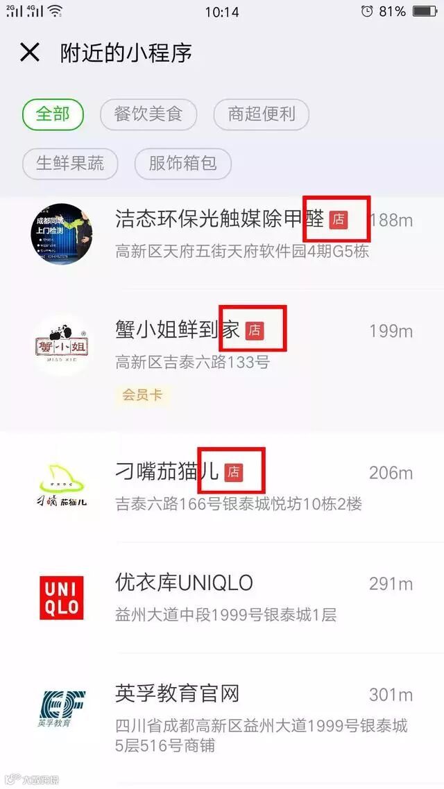 出现“店”标识,这正是合并的第一步,这也间接的清晰了小程序的发展方向,发力实体商家,将线上与线下实体商家的结合!