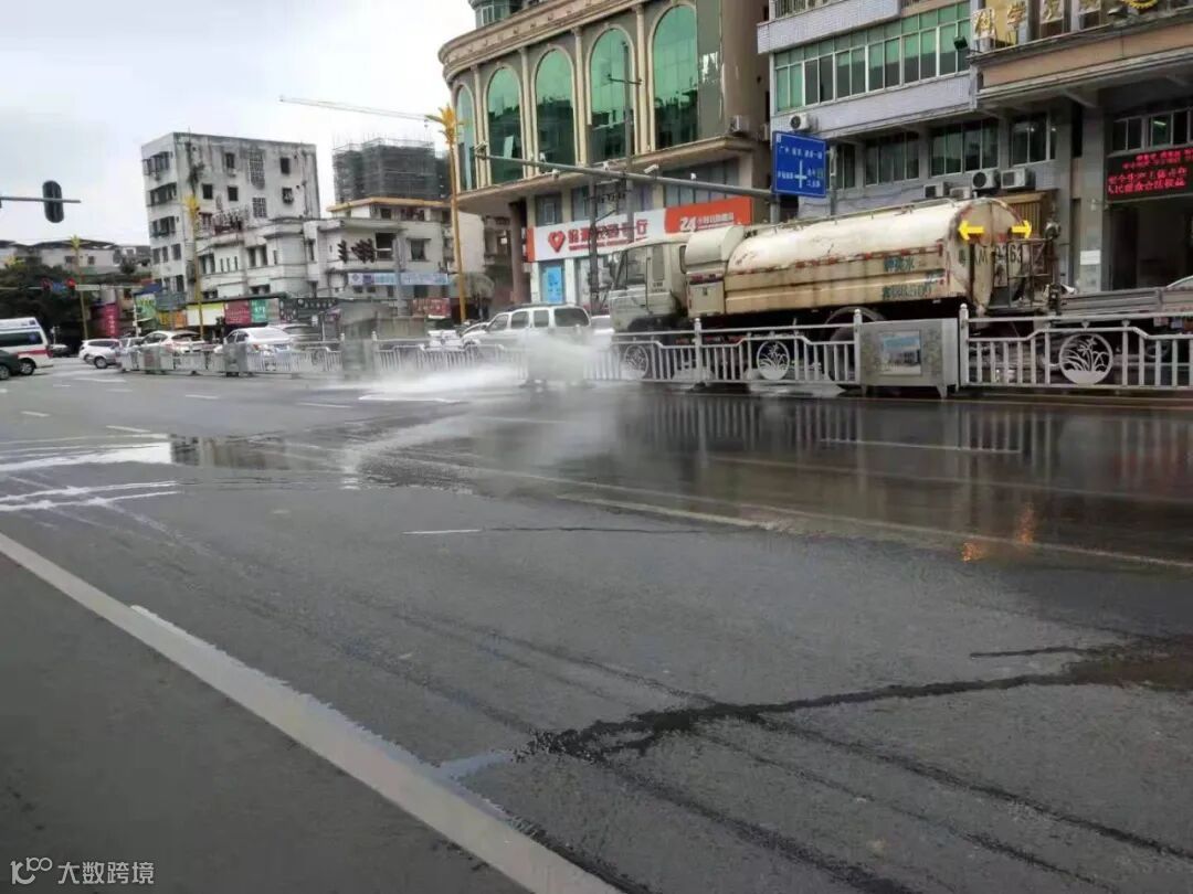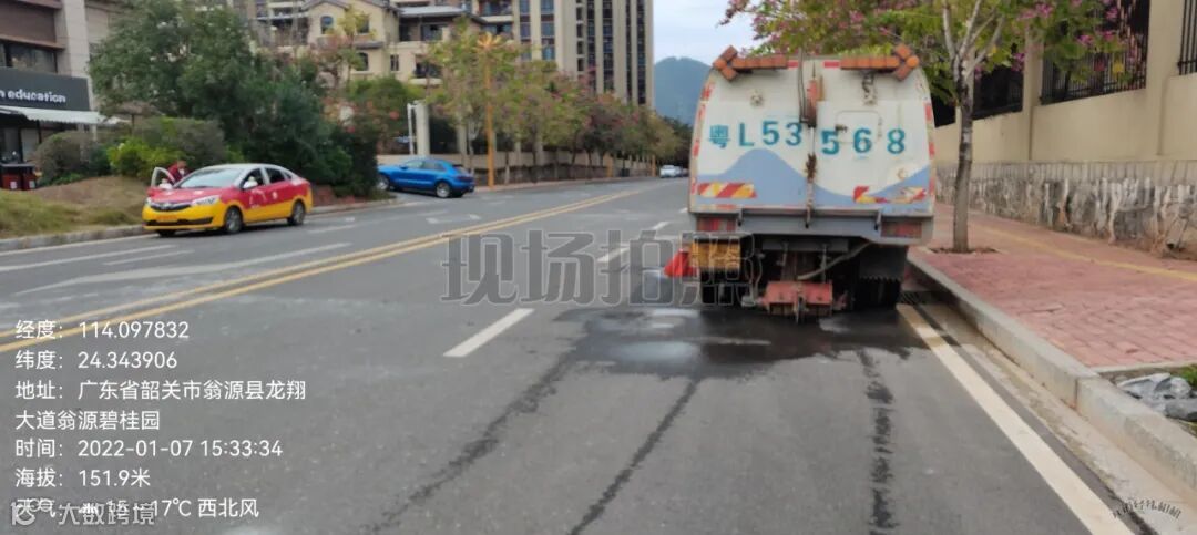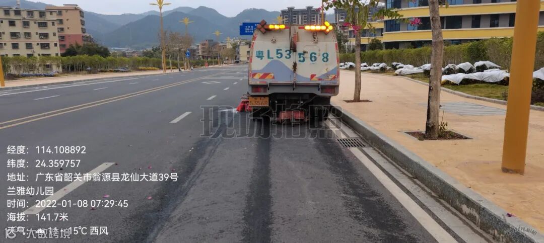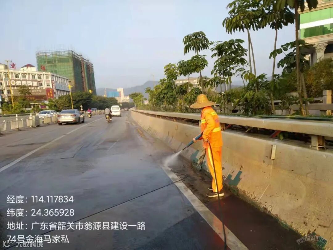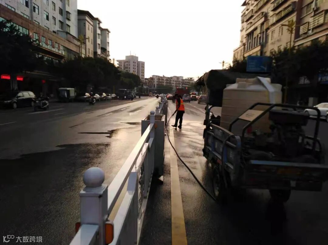 4、利用高压冲洗车及洒水车全面冲洗中间护栏及人行道。