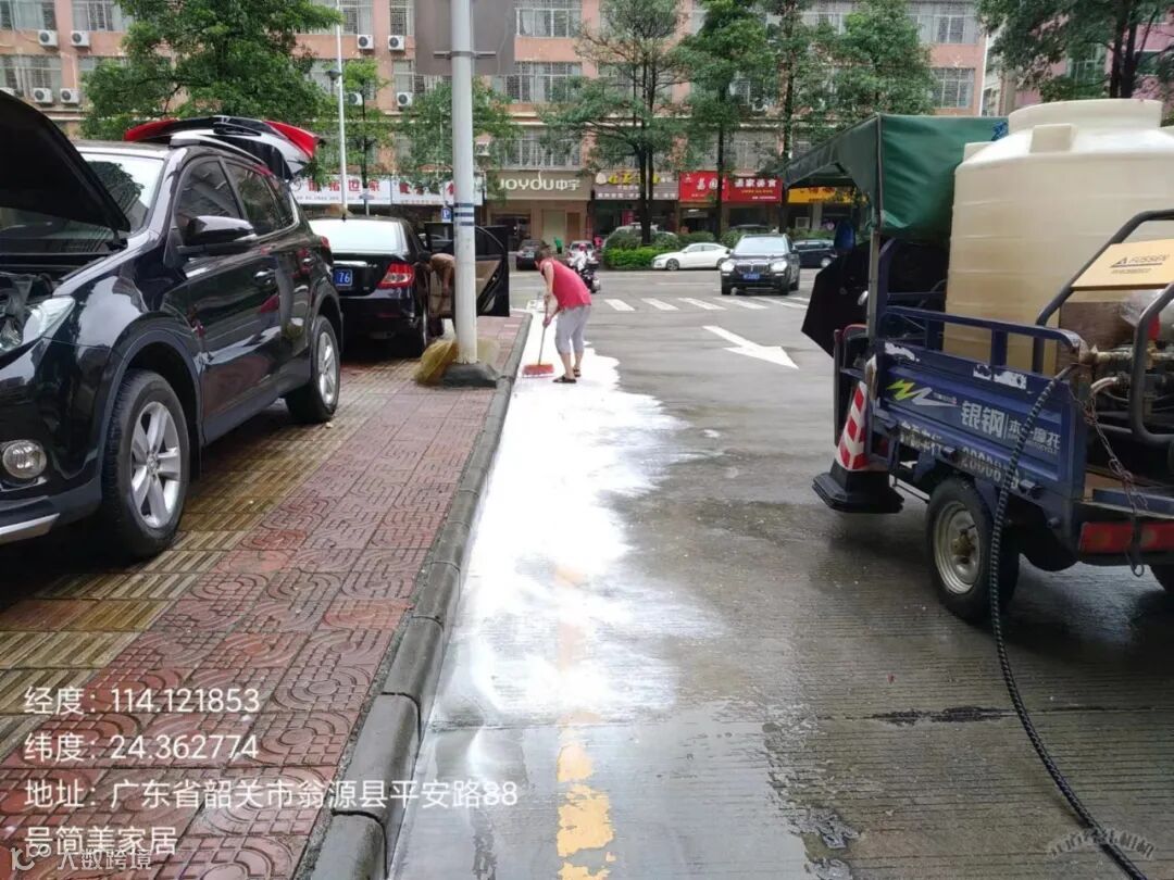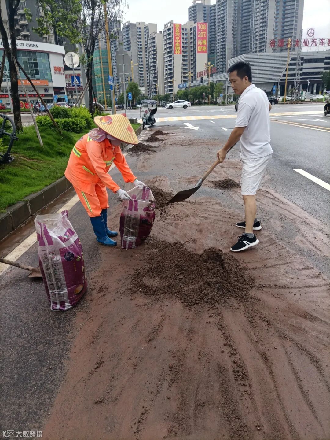 3、临调人员清理及冲洗县城暴雨水后大量流出路面泥巴和垃圾。