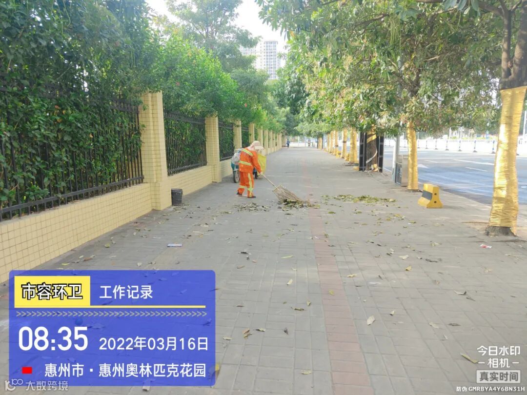 2、受天气原因影响落叶增多,增加人行道及慢车道巡回落叶清理频次,突击队协助清理惠博大道等绿化带死角卫生;