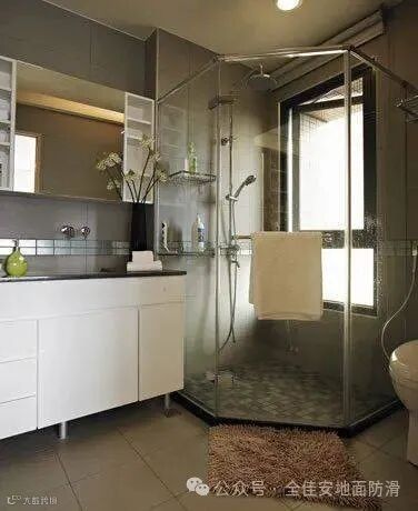 浴室防滑建材主要还是考虑石英砖、仿古瓷砖、金刚砂瓷砖三类,铺设适当的坡度可以保证积水顺利的从地漏排出。然后用瓷砖防滑剂进行防滑处理,即使有水及沐浴露的情况下可以大大增加脚底与地面的摩擦力, 既美观又实用。