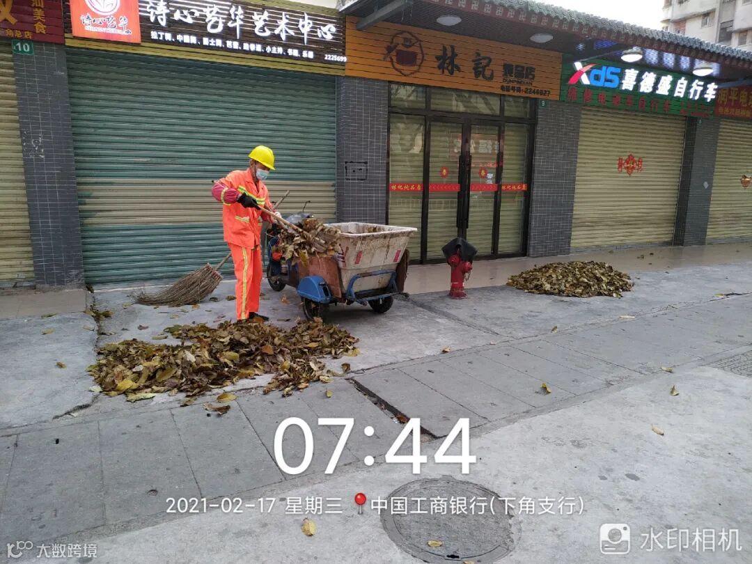 1、春节期间各部门加班加点,精细化保洁辖区各路段,因气候原因落叶增多,增加落叶段人行道清理频次,并每日抽调其他部门支援步行街,环城西路等人流较大路段,保障重点路段环境卫生状况;