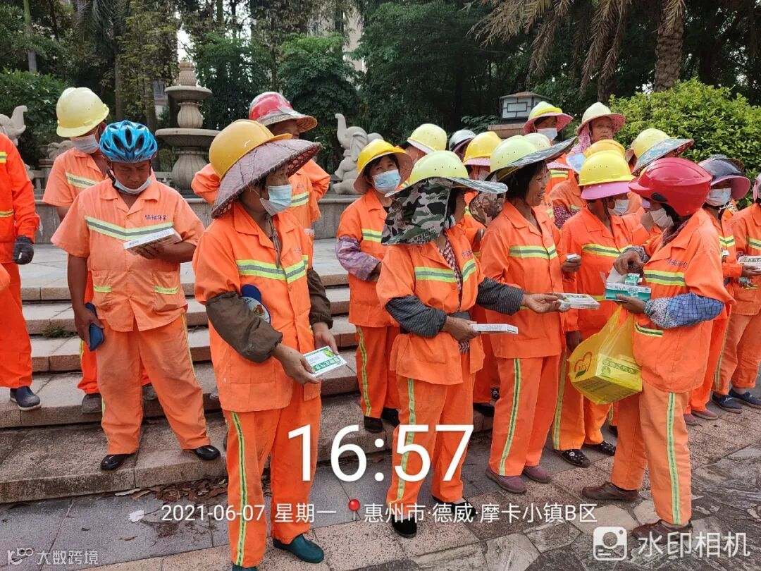 1、管理人员会议及一线员工每周例会,天气炎热,为员工发放藿香正气水等防暑物资,保障高温天气环卫工作的正常开展;