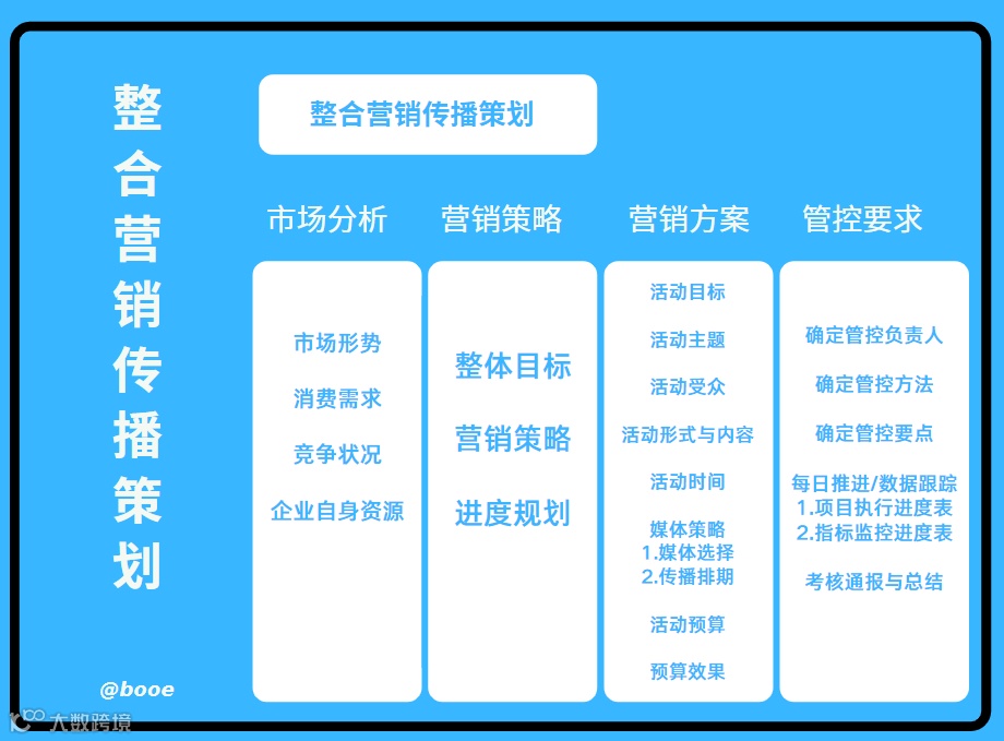 概括来说,先做市场分析,再做消费者分析,产品卖点提炼,定主策略;根据主策略做分阶段规划(资源、人力、节奏等),对应做目标的拆解细分和量化;之后就是媒介和内容策略,以及规划战役中的必杀一招;进入执行阶段后,注意动态调整和根据市场反馈的规划,最后是评估和后向效果调研、复盘。