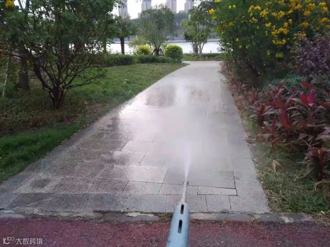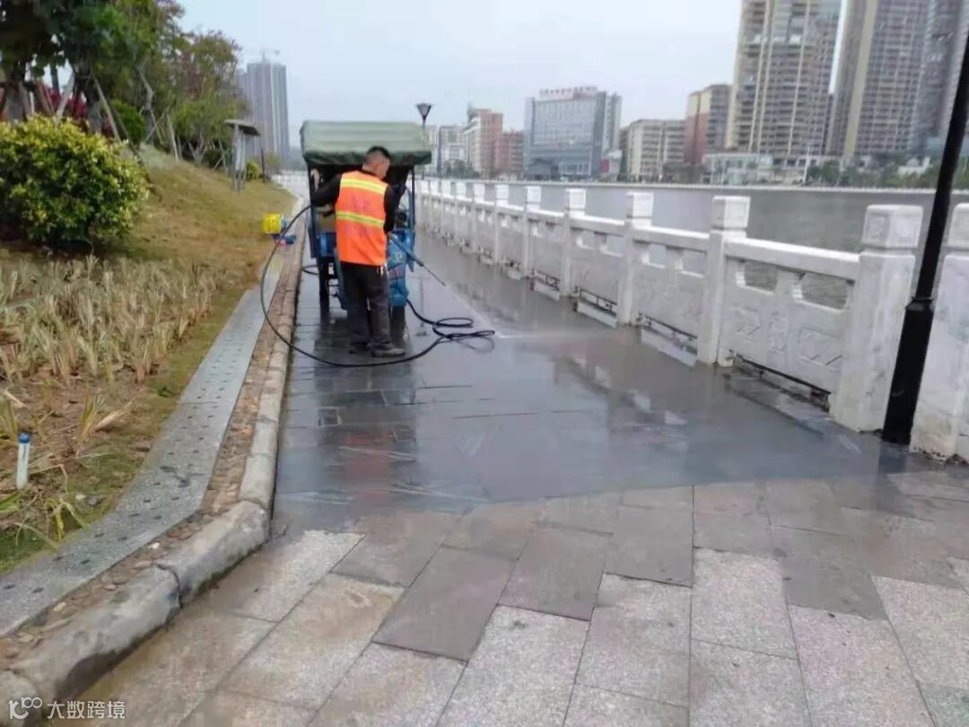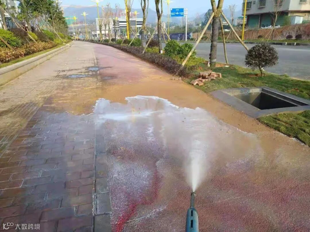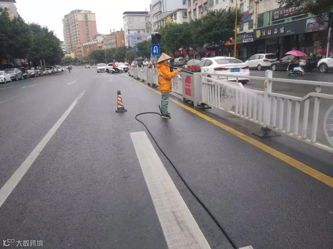 5、两台高压清洗车对龙湖绿道护栏、下水道口、垃圾桶脚、公路中间护栏、人行道、公共环卫设施、公益广告栏、朝阳路和德政路车辆落下泥巴进行清洗。