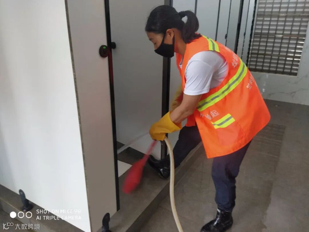 5、继续坚持每天2次对县区环卫设施及公厕、人行道、公共场所路面进行清洗、消毒。