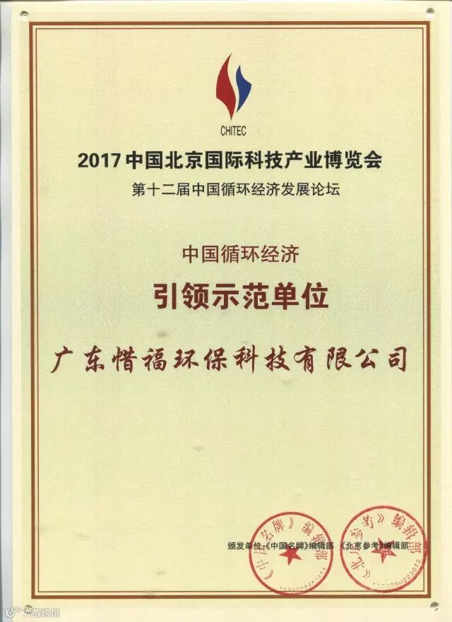 6月25日在京举行的“2017中国北京国际科技产业博览会• 第十二届中国循环经济发展论坛”上, 创建全国“环卫服务资源回收一体化运营模式”即“珠海横琴模式”的广东惜福环保科技有限公司,荣获十大“中国循环经济引领示范单位”称号,获此殊荣的还有:北京环卫集团微环境管理有限公司、深圳零到一生态科技有限公司、新疆红旗坡农场以及安徽省铜陵市、湖南省娄底市、山东省枣庄市、黑龙江省鸡西市、江西省景德镇市、湖北省黄石市等也获得“全国十大循环引领示范单位”称号。