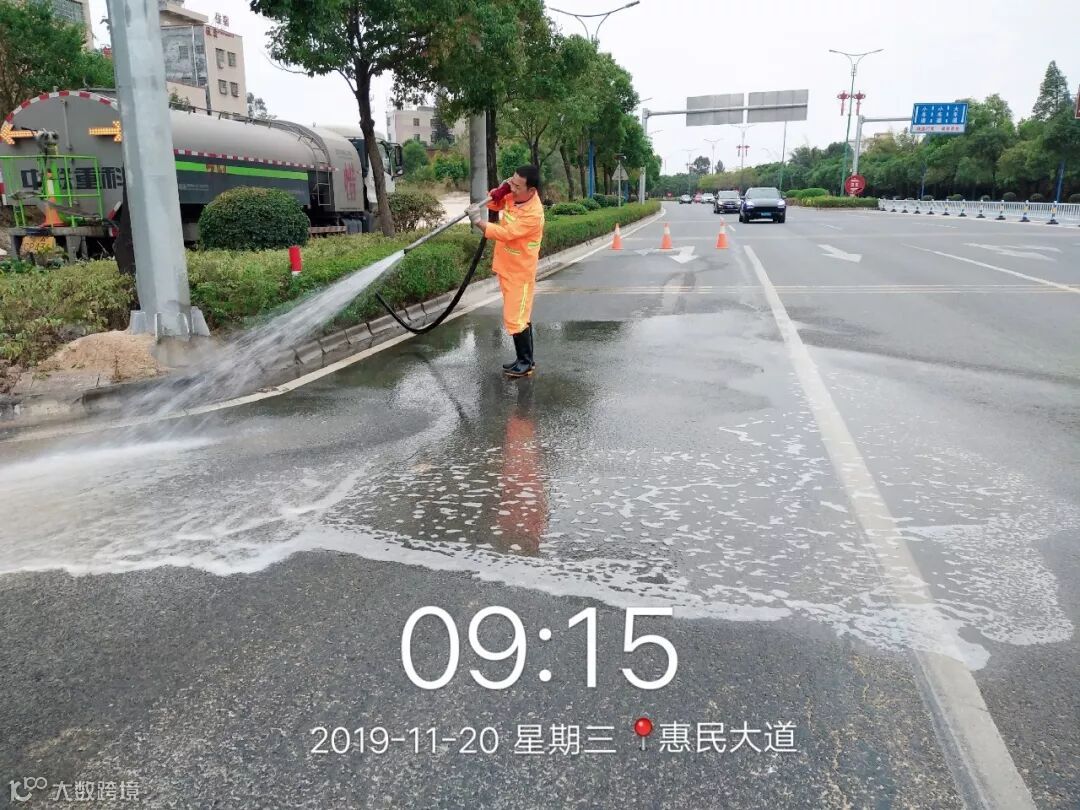 3、白天、夜间进行道路清扫、洒水,高压冲洗停车场垃圾点、广仍公路、金石四路、新旺路,惠民大道,高速公路出入口等路段;对文明一路,文昌一路等人行道路段冲洗,垃圾车正常作业清运垃圾;