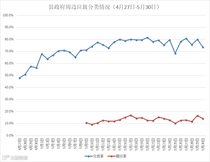 垃圾分类得到居民的大力支持。在督导员的劝导下,近八成居民做到分类投放,其中将近两成居民实现了准确分类