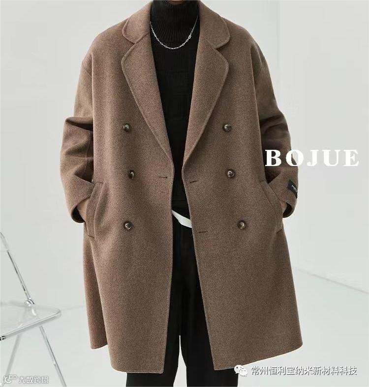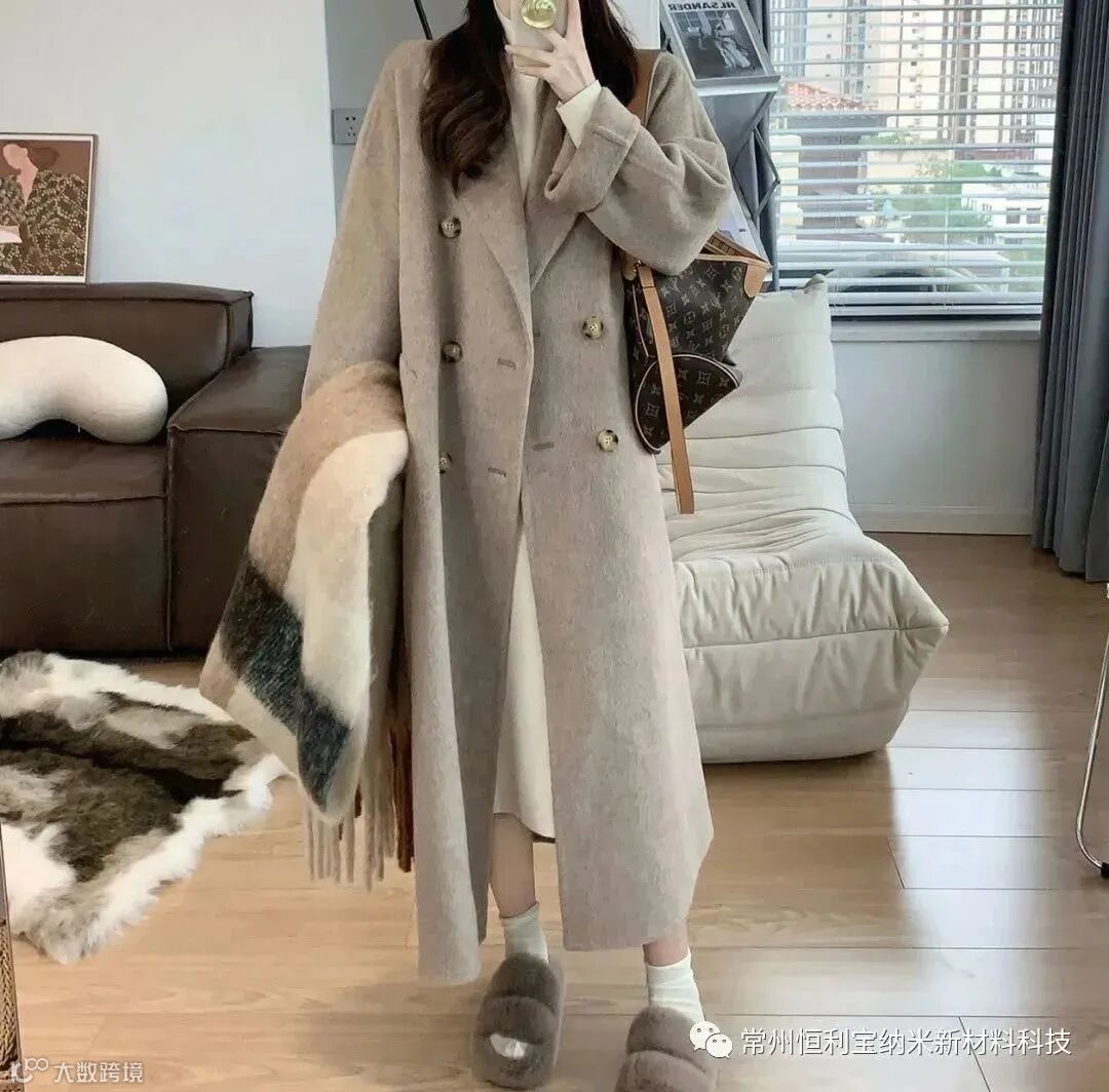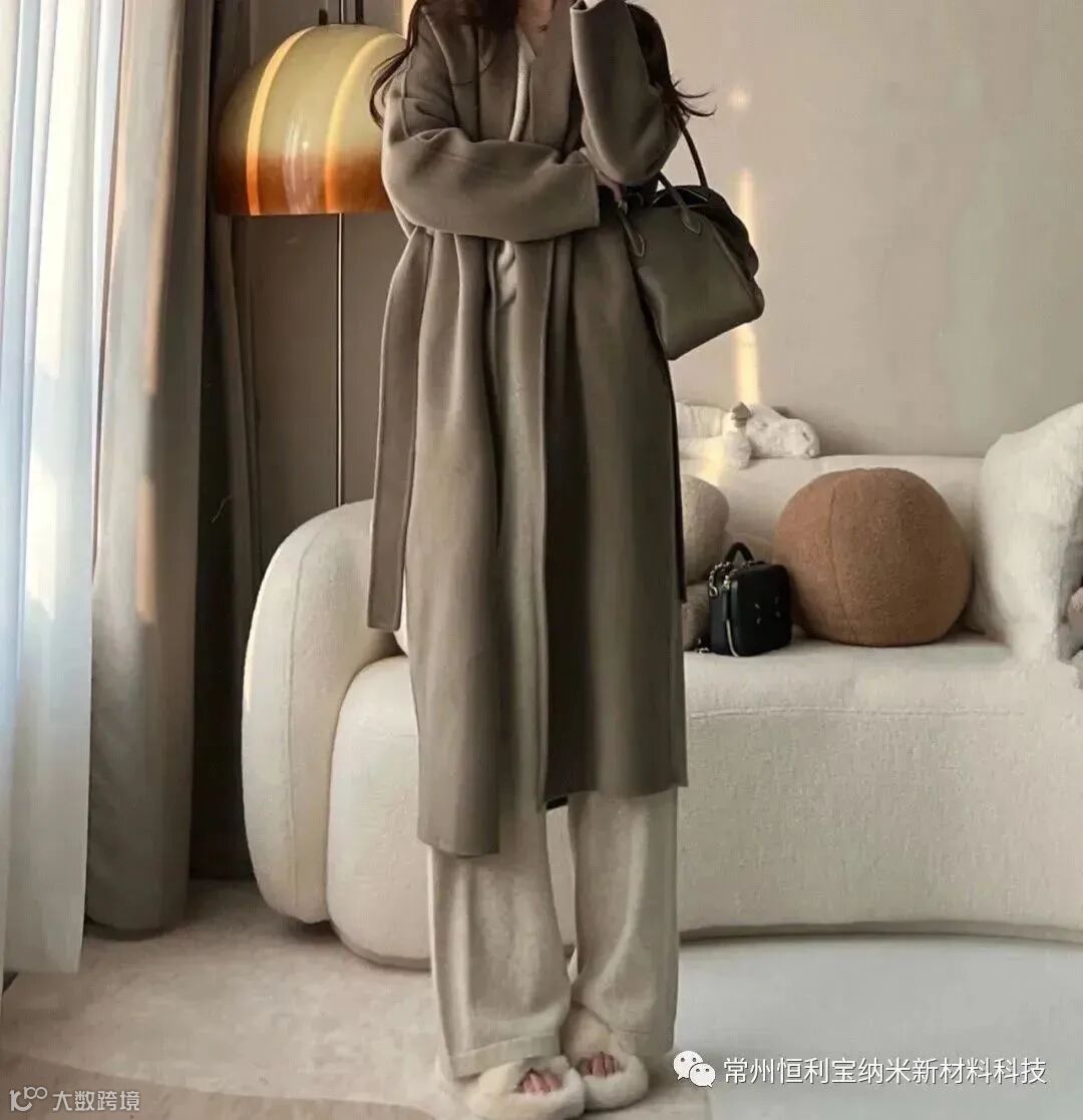 石墨烯双面面料上下两层是独立面料,中间由纱线连接而成,无胶合,因而更加轻盈。面料颜色可双面相同,也可双面双色,时尚表现力更强。双面面料做大衣不需要内衬,更厚实、更挺括,平整且不易起皱。因此相较于单层的羊绒、羊毛材质,它要更加保暖。