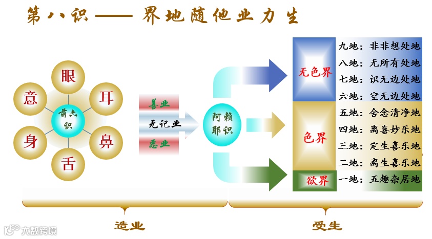 第八识在三界九地中是随业力不同而界地有所差别,依之生于任何一地,业力未尽时,恒起该一地的业识;不像第六识那样,虽生此界,亦可生起余界识、造余界业;是故于八识之中,纯属随业力而生者,唯此第八识;纯属非由业力而生者,是第七识;一分随业力而生、一分不随业而生者是前六识。然于前六识中的前五识多随业力生,随缘任运起故;第六识多非随业力生,自识分别起故。