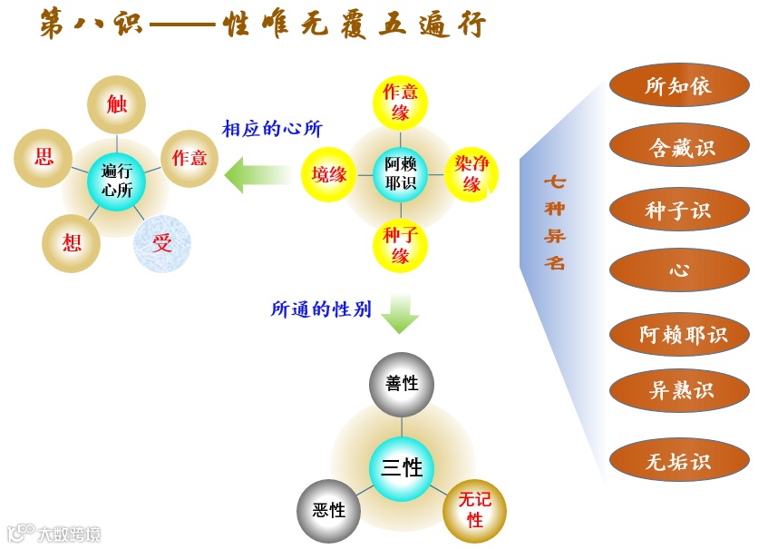 “五遍行——意触受想思”,说明与第八识相应的心所最少,它很简单,只有遍行五所,其他统统不相应,第八识于三境中唯属性境,于三量中唯属现量。