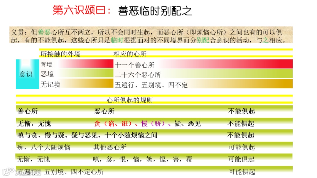至于五遍行、五别境、及四不定心所,本身没有善恶的属性,是随著善、恶、无记三种心性,其体也就成为或善或恶或不定性,所以可以与善、烦恼心所同时生起。
