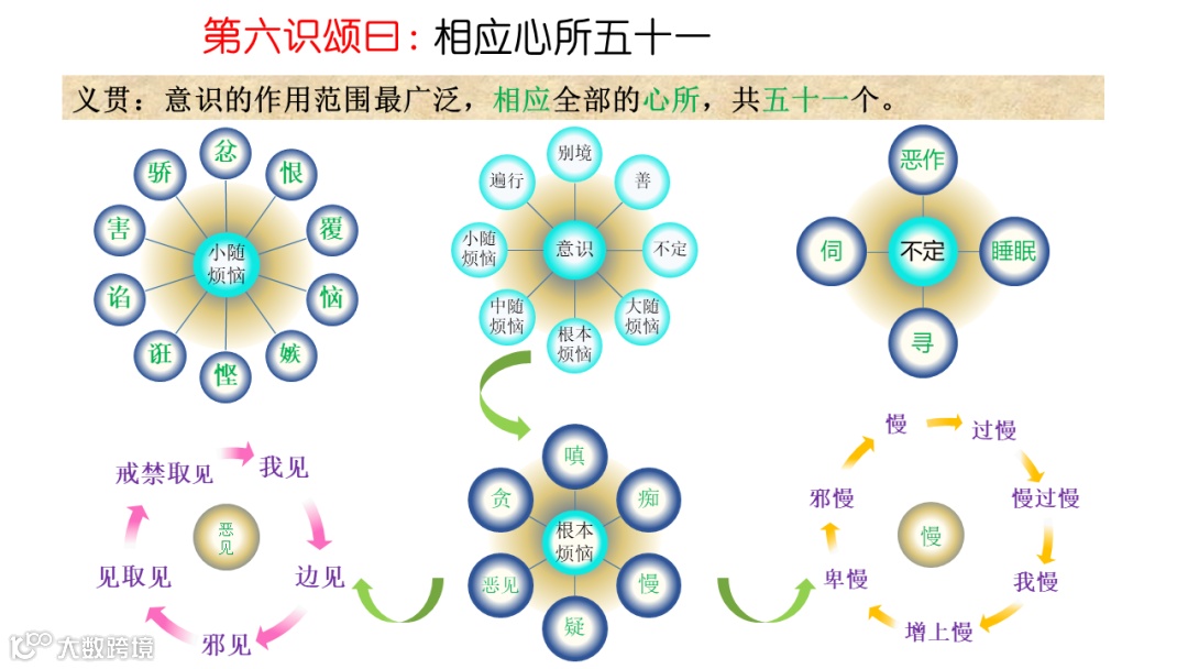在三界六道轮转的时候,第六意识的作用是显而易见,所有的五十一个心所与第六意识统统相应。