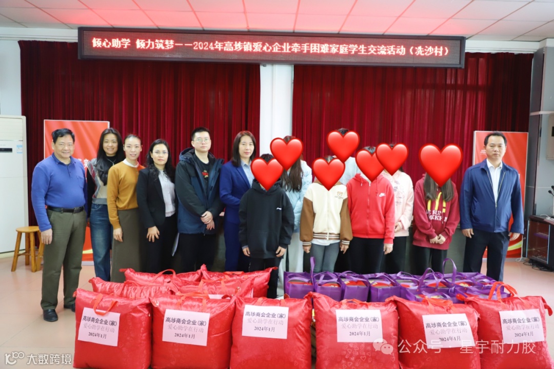 2024年春节前,由高埗镇工商联组织“倾心助学 倾力筑梦-2024年高埗镇爱心企业牵手困难家庭学生交流活动”为主题的活动在洗沙村举行。这次活动旨在关爱困难家庭学生,广东星宇耐力新材料股份有限公司积极参与并支持。