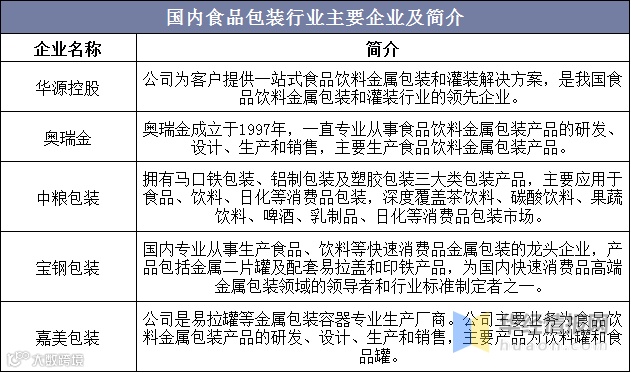 近几年来,我国国内食品包装行业在迅速发展,但行业集中度仍然较低。目前食品包装行业主要企业有华源控股、奥瑞金、中粮包装、宝钢包装、嘉美包装等企业。