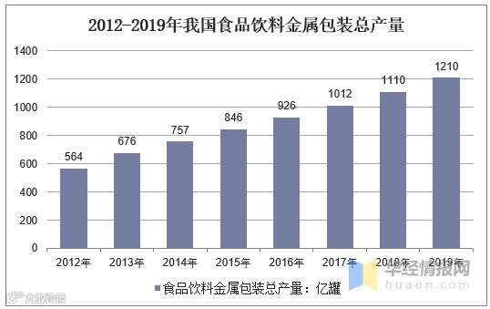 目前我国食品饮料包装材料主要使用的是金属材料,2016年,我国食品饮料金属包装总产量达到926亿罐,2018年达到亿罐,2019我国食品饮料金属包装总产量达到1210亿罐。