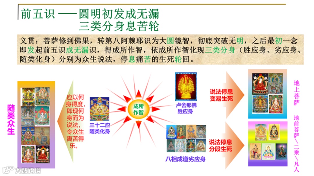 身体是物质,背后是智慧在指导它做事,做完马上放下,放下再做,事来则应,事去则不留,这就是同圆镜。自性最初发起光明的时候,前五识才转成无漏的“成所作智”,到了这个时候,就能够现三类的化身,来救拔止息众生中三界内外的生死。三类众生如下: