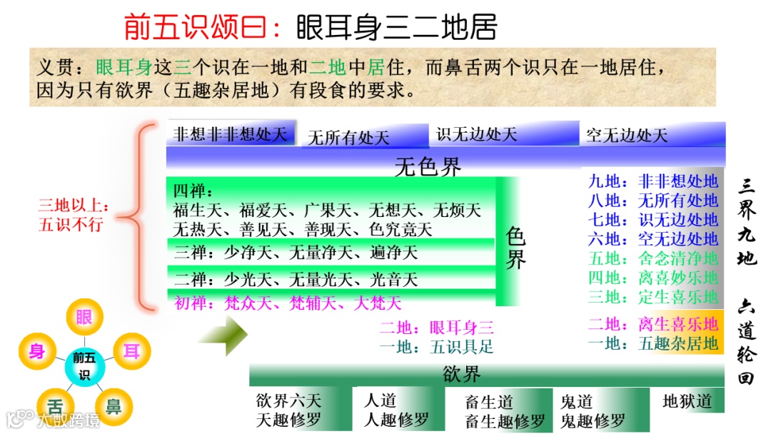 眼耳身这三识就到色界初禅就为止了,由于八个识在三界九地中,各别