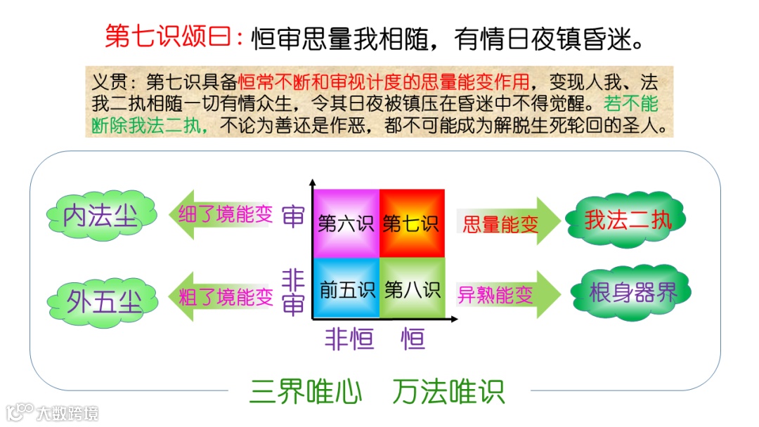 第七识具备恒常不断和审视计度的思量能变作用,变现人我、法我二执相随一切有情众生,令其日夜被镇压在昏迷中不得觉醒。若不能断除我法二执,不论为善还是作恶,都不可能成为解脱生死轮回的圣人。