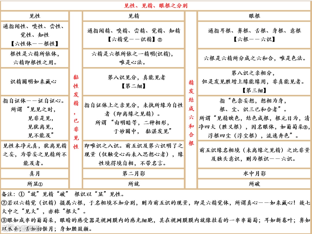 总之,见性与见精不同,见精与妄见不同。见性与识性有微妙的区别。识性是分别的、是动态的,见性是无分别、是澄寂的、澄清的,非和非合,这些闻、听、觉、知的五根之性,也是一样,不应当此识之生起的因缘,完全没有因缘就可以跑出识心,不可能的,必须借重于因缘,但是,因缘当体即空。