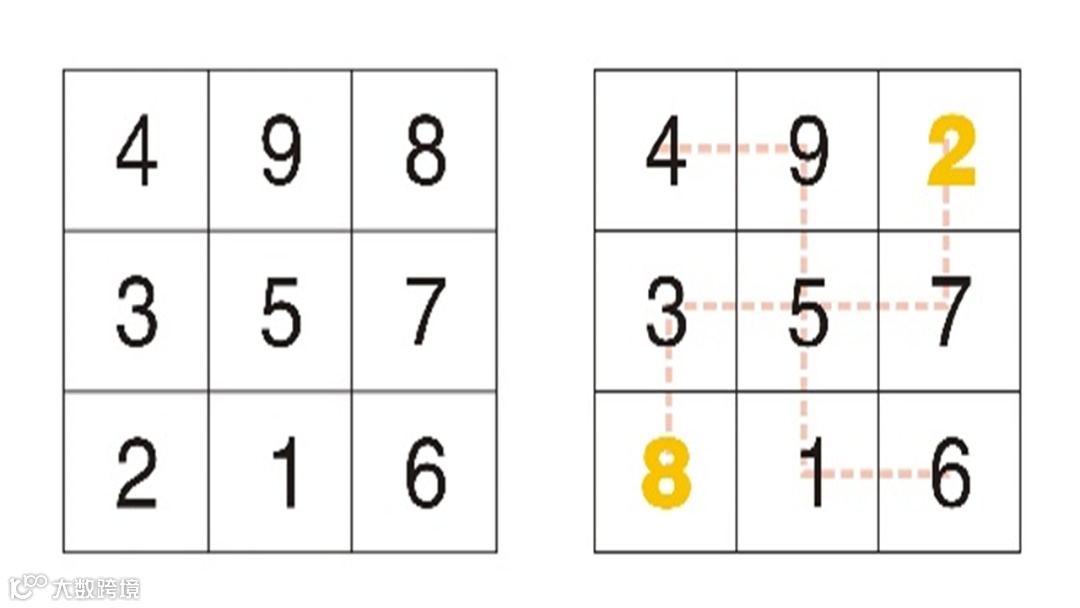 如果二八互易之后,就变成了第二幅图,无论是上下还是对角线,数字之和皆为15,代表宇宙和谐之道,难怪十五的月亮总是最圆满的!