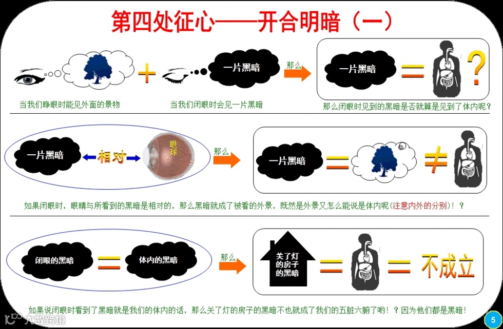 如果看见黑暗现象,名为见内,那么处在完全没有日月灯光的黑暗室内,能说室内这种黑暗现象,就是你的五脏六腑吗?