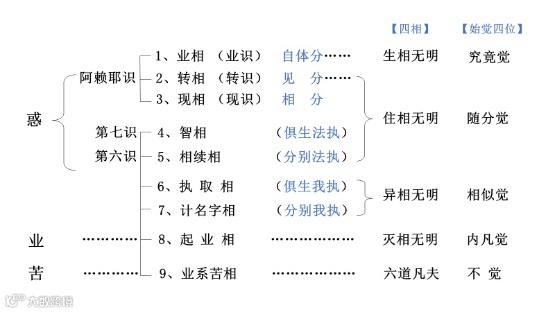 《大乘起信论》云:“以有境界缘故,复生六种相。云何为六?一者智相,依于境界,心起分别,爱与不爱故。二者相续相,依于智故,生其苦乐,觉心起念,相应不断故。三者执取相,依于相续,缘念境界,住持苦乐,心起着故。四者计名字相,依于妄执,分别假名言相故。五者起业相,依于名字,寻名取相,造种种业故。六者业系苦相,以依业受果,不自在故。当知无明能生一切染法,以一切染法皆是不觉相故。”
