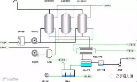 利用吸附剂(粒状活性炭和活性炭纤维)的多孔结构,将废气中的VOC捕获。将含VOC的有机废气通过活性炭床,其中的VOC被吸附剂吸附,废气得到净化,而排入大气。