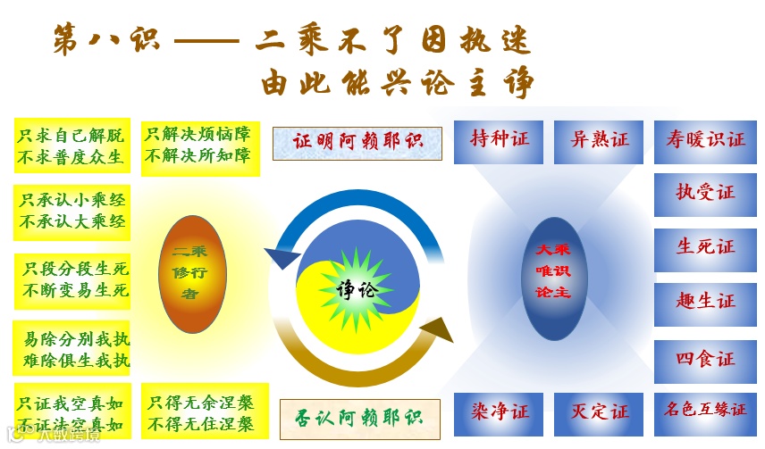 可大乘唯识家论主,他们主张是有这个第八识“阿赖耶识”存在,可小乘说无,大乘的唯识的论师说有,就这样,一个说有,一个说无,于是大小二乘就争论起来了。