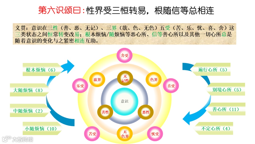 它通于善恶无记,造恶是它,造了以后在佛前忏悔的也是它,都是第六意识,乃至于平常没有事的时候,保持无记也是它。所以第六意识善、恶、无记三种功能全部具足。