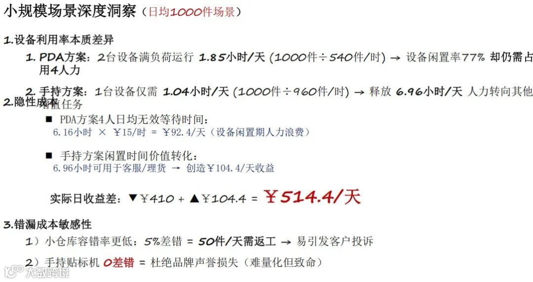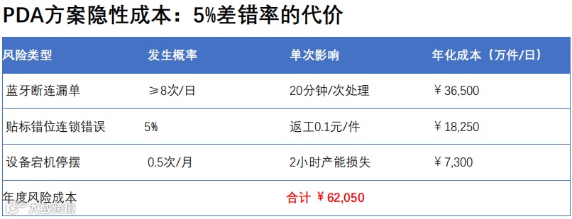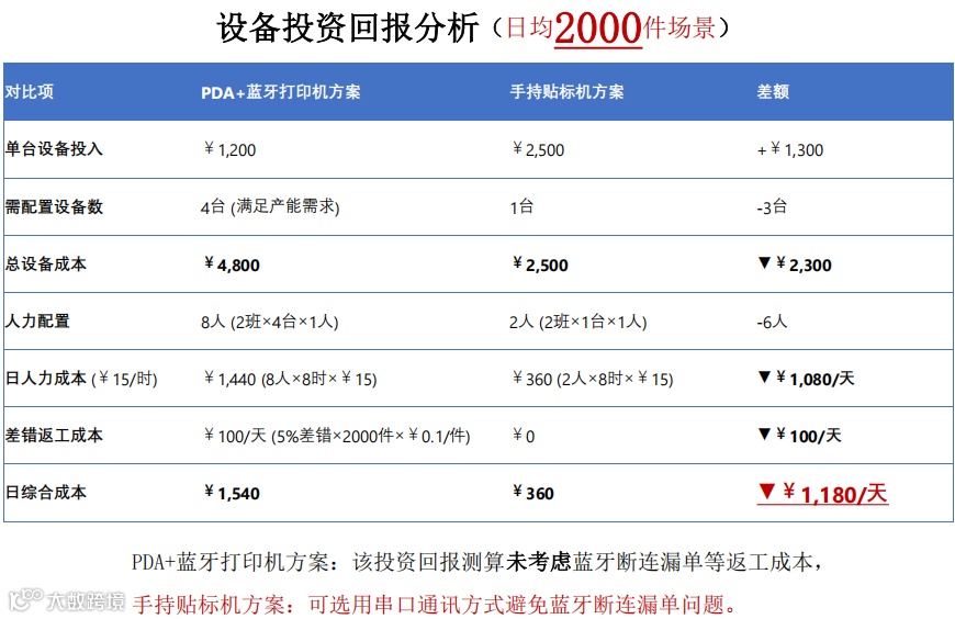 ◼ PDA+蓝牙打印机方案:需增配0.5人 → 年成本