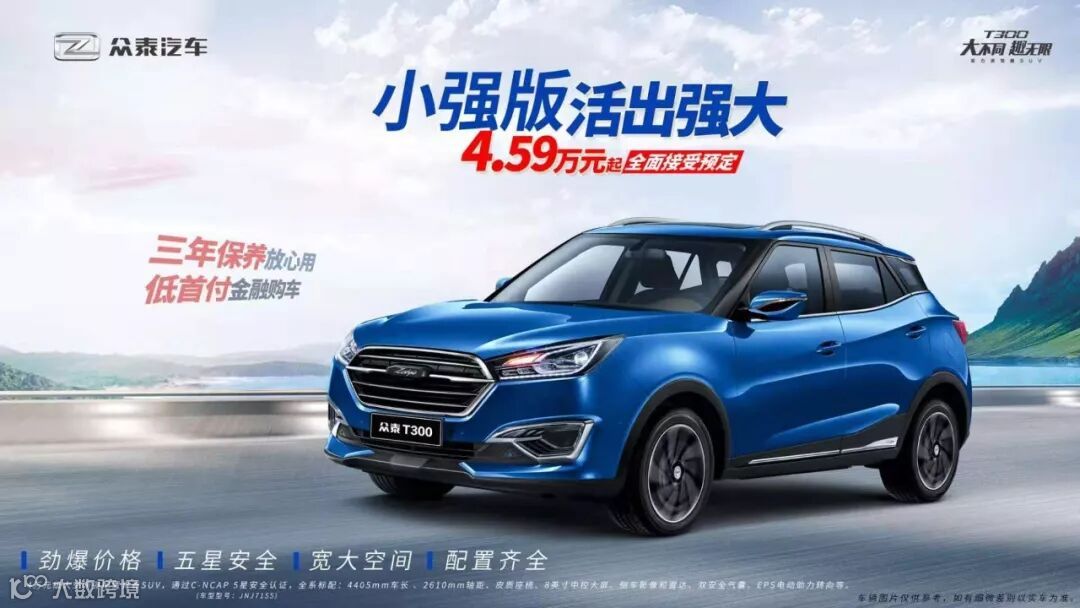 4万元级大空间强配置青春SUV——众泰T300小强版已到店。小强版包括1.5L手动挡和1.5L自动挡两款车型,价格分别为4.59万和5.59万元。