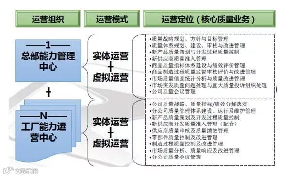 建立1 N质量运营管理模型,以“1”个总部质量能力管理中心,“N”个基地质量能力运营中心这样的模式,强化总部中心的战略和绩效管理能力、监督检查能力、虚拟组织运营能力及重点质量问题推进落实,生产基地重点落实总部的质量战略和绩效管理要求、持续改进过程能力和零部件质量、快速解决市场用户问题。
