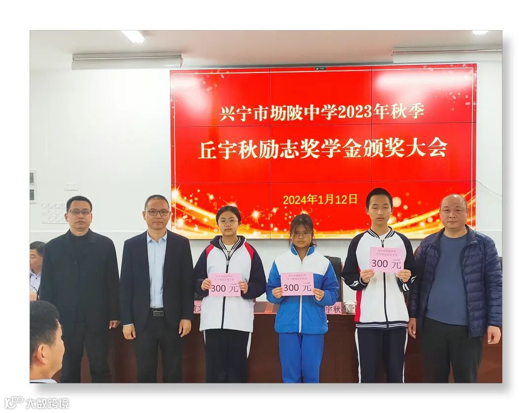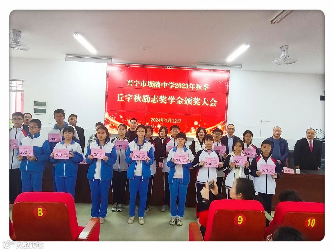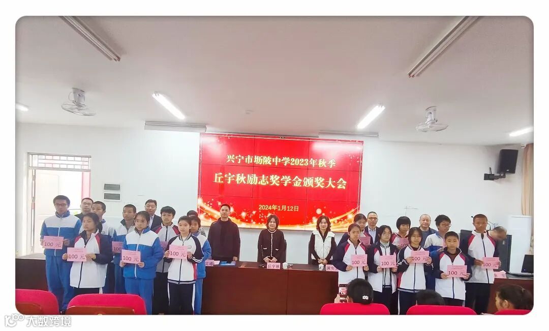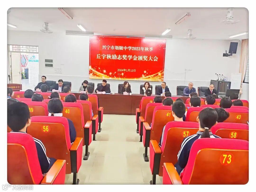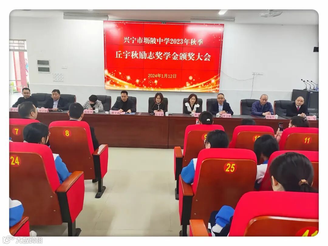勤学力行创优秀,奖优劝善惠学子。2024年1月12日上午,兴宁市坜陂中学在学校演播厅隆重举行2023年秋季“丘宇秋励志奖学金”颁奖大会。出席此次会议的人员有:乡贤丘宇秋女士及其好友黄女士、兴宁市教师发展中心副主任黄文通、兴宁市教师发展中心干部档案信息管理股股长杨艳芳、学校行政班子、年级主任、班主任、家委会家长代表以及获奖学生。颁奖大会在学校副校长刘文标热情洋溢、振奋人心的主持下展开序幕。