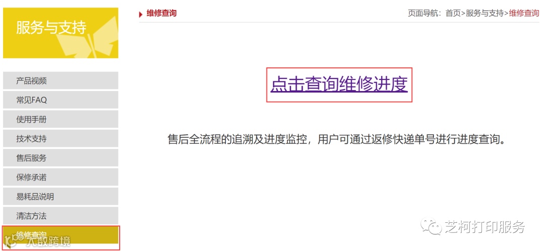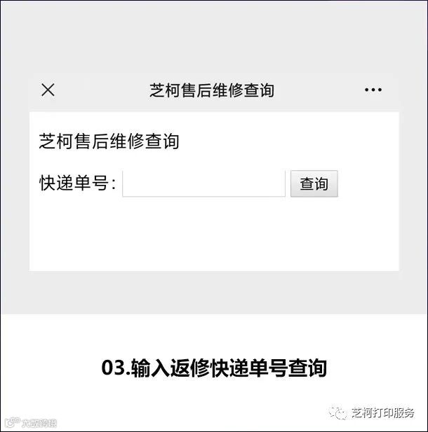 ① 通过“芝柯打印服务”公众号查询,在【公众号菜单栏】→【维修查询】→【维修查询】,点击输入返修快递单号即可查询返修状态。