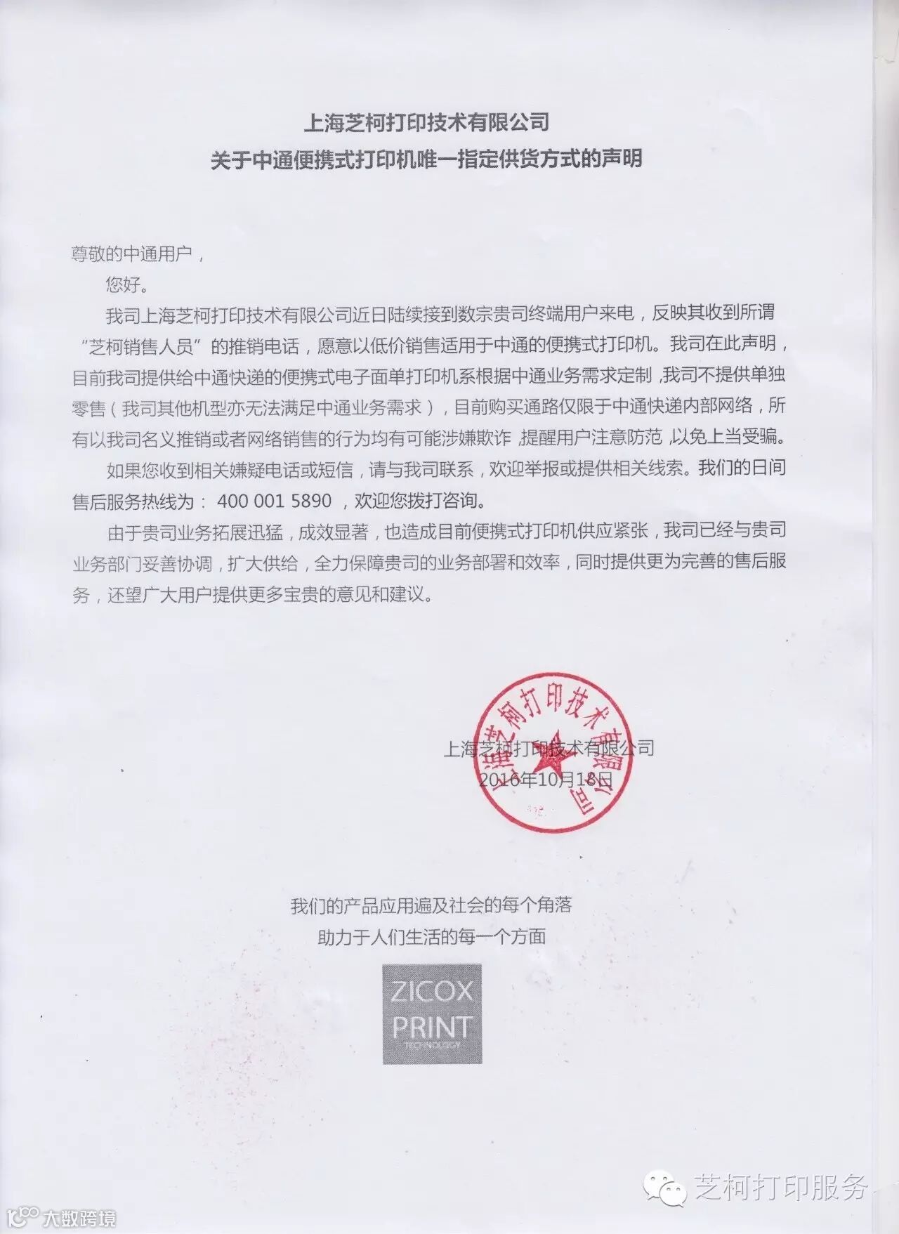 我司上海芝柯打印技术有限公司近日陆续接到数宗贵司终端用户来电,反映其收到所谓“芝柯销售人员”的推销电话,愿意以低价销售适用于中通的便携式打印机。我司在此声明,目前我司提供给中通快递的便携式电子面单打印机系根据中通业务需求定制,我司不提供单独零售(我司其他机型亦无法满足中通业务需求),目前购买通路仅限于中通快递内部网络,所有以我司名义推销或者网络销售的行为均有可能涉嫌欺诈,提醒用户注意防范,以免上当受骗。