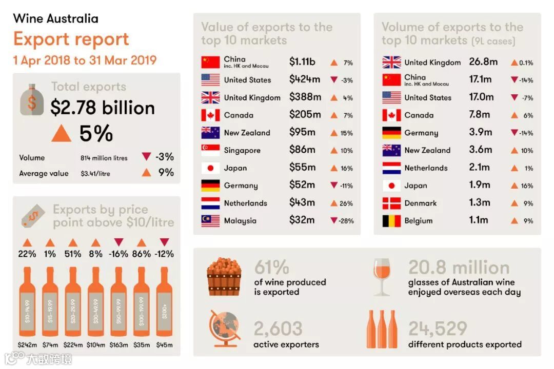 截至2018年底,澳大利亚葡萄酒对中国市场(包括中国香港和中国澳门)的出口额增长18%至11.4亿澳元,出口量增长7%至1.72亿升,平均每升葡萄酒价格增长11%至6.64澳元/升。中国内地目前是10澳元/升及以上价位的澳大利亚葡萄酒最大出口市场,占该价位澳大利亚葡萄酒全球出口量的一半,出口额增长38%至5.2亿澳元,“体现了中国市场对高端精品澳大利亚葡萄酒的强劲需求”。