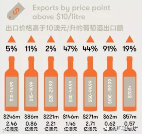 从上图所示,澳洲出口的葡萄酒$100-199澳币的葡萄酒增长91%,换句话说,澳洲高端葡萄酒在中国颇受欢迎!
