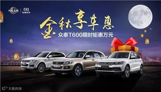 中秋来临之际,众泰汽车旗下T600全系车型推出促销政策——“金秋享乐惠 众泰T600限时万元钜惠”感恩回馈广大消费者。本次活动是为消费者量身打造的低门槛购车方案,将消费者购车的压力降到最低,享受好车的同时又不增加负担。