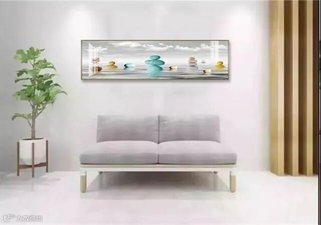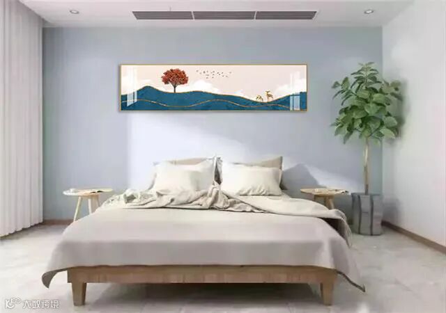 3、挂画在装裱时,最好避免选择玻璃镜面的,因为这样比较容易走光,从而影响视觉效果。挂放时宽形墙面挂横向壁画,长形墙面以竖向的画作挂放。