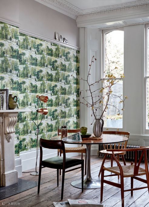 墨绿色带有浓厚的怀旧气息,在这张极具个性墙纸上的图案中包含了一系列的绿色色调,这是一种巧妙将墨绿色引入家居中的方式,而不需要把整面墙都涂刷成绿色,柔和、舒适的色调,让餐厅装饰带有小清新的感觉,整个设计低调而高级。