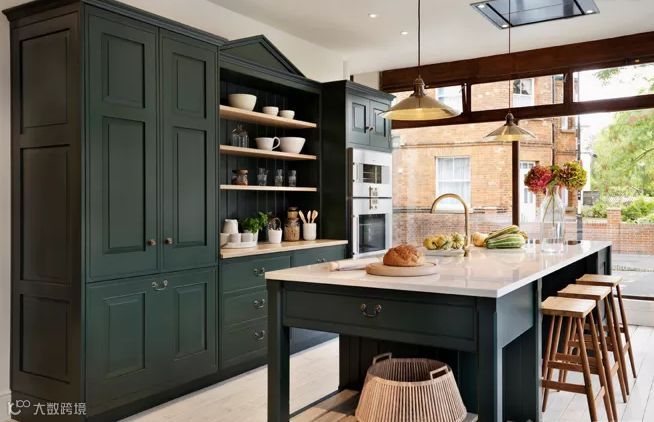 这个墨绿色的厨房既优雅,又充满一种怀旧的气息,在大自然中,绿色和棕色常常是配对的,因此将这两种颜色组合在一起是不错的想法,在浅色木材和天然材料的衬托下,深色调橱柜看起来更加精致,也突出了橱柜的经典样式设计。