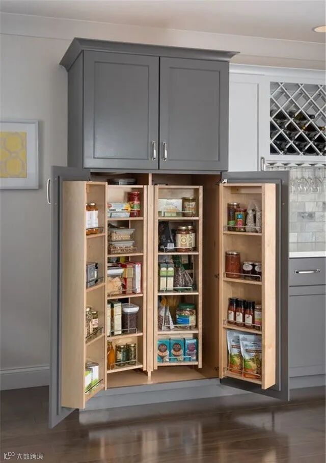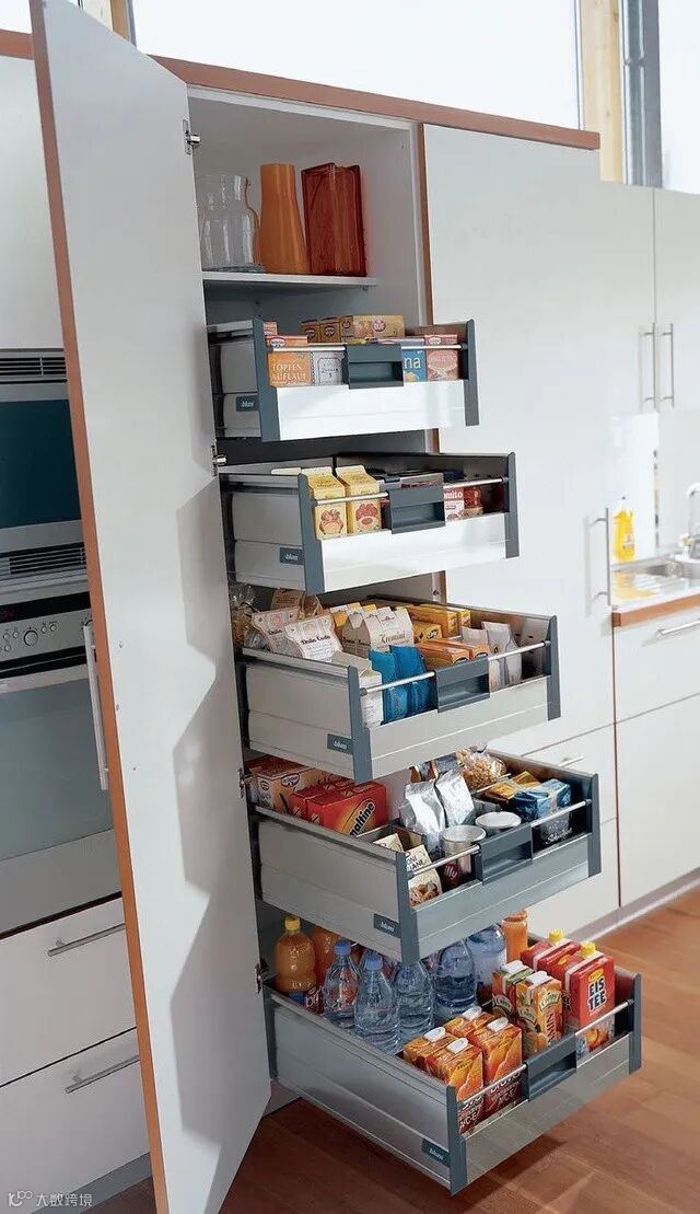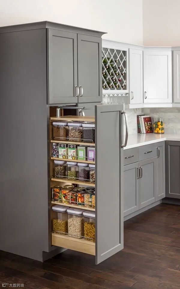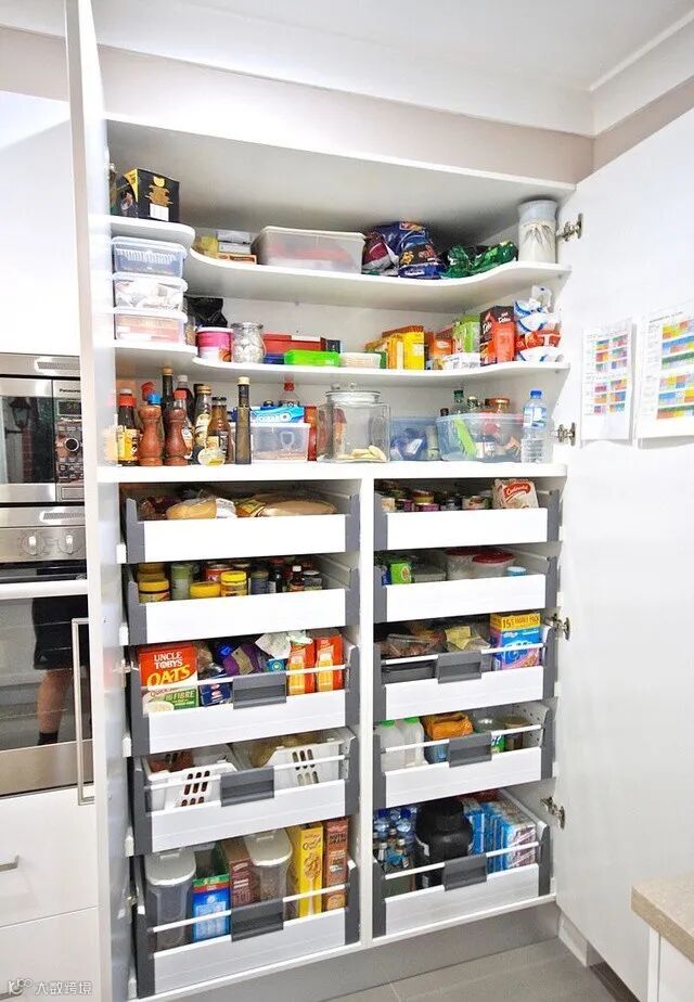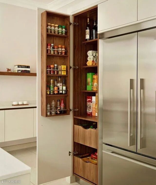 家庭装修,厨房空间有限又想要更多的收纳空间怎么办?可以在厨房里放一个定制高柜,像这样的柜体可以增加很多收纳空,可以让你的厨房得整整齐齐!