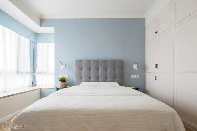选高背床头板,可以避免头顶着墙睡造成的不舒服感。两边床头柜不对称布置也很好看,可以根据看谁习惯睡哪边、床前有无阅读习惯等来安排。