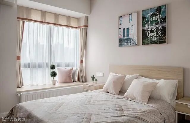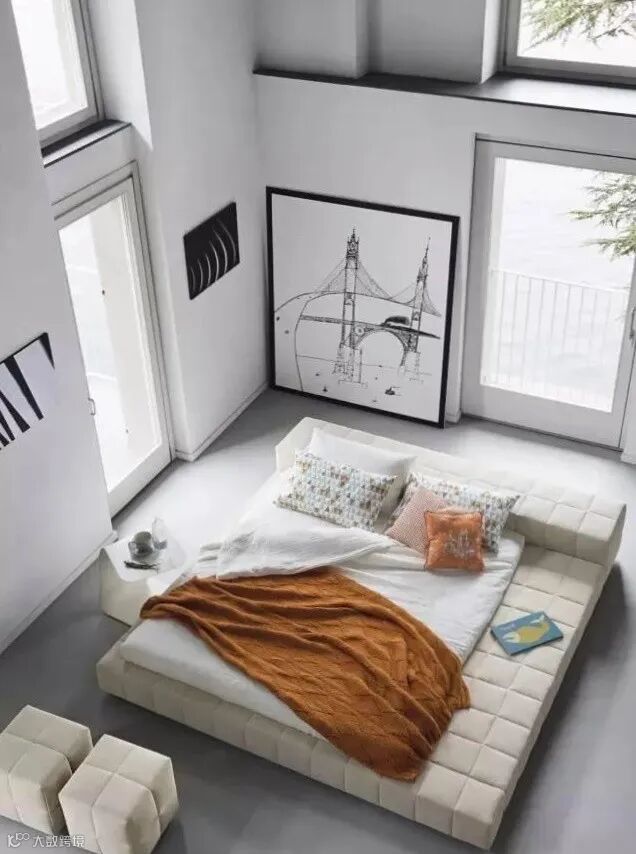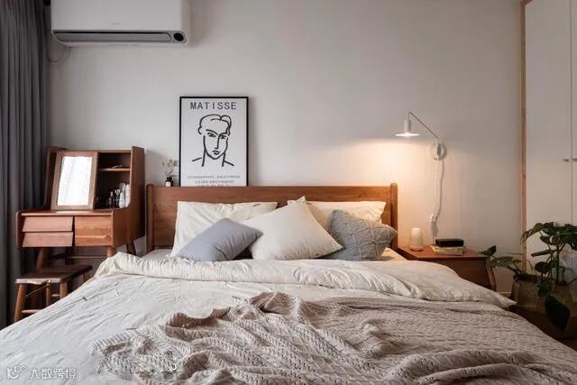 还可以用大块靠枕、长条抱枕替代床头板功能,也是常见床头布置手法,且枕套还可定期拆洗,比起绷布床头板还易维持干净。喜欢的海报、比较有feel的旅行照片,也可以用拼贴的方法装饰床头主墙。